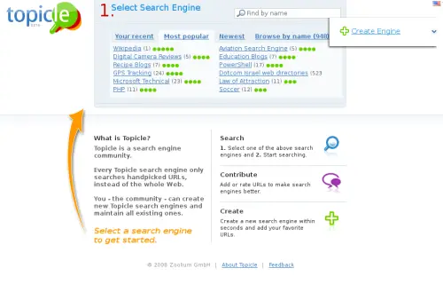 Topicle is simple to get started with; just click on "Create Engine", name your search engine, add a few of your favorite sites to search within, and you're all set. More sites can be added later as you find them.